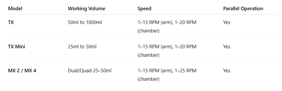 - Scalability: From 25 ml to 2000 ml with multiple configurations (TX and MX models)